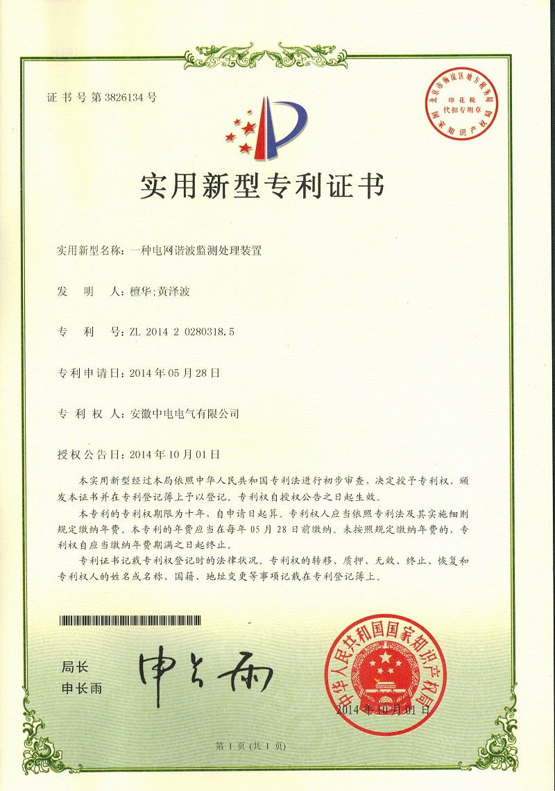 證書-電網(wǎng)諧波檢測處理裝置