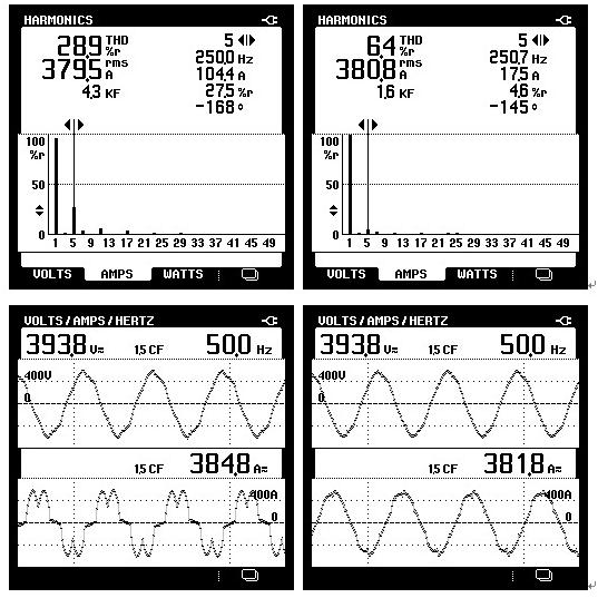從下圖可以看出,加裝ZD-AMS有源濾波裝置前總諧波含量28.9%(如圖2), 加裝之后的總諧波含量降至6.4%(如圖2) ,電網(wǎng)的電流畸變率大幅降低,電流波形較諧波治理前更接近理想正弦波,同時(shí)ZD-AMS有源濾波器的投入也使無(wú)功補(bǔ)償柜能夠正常的投入運(yùn)行。