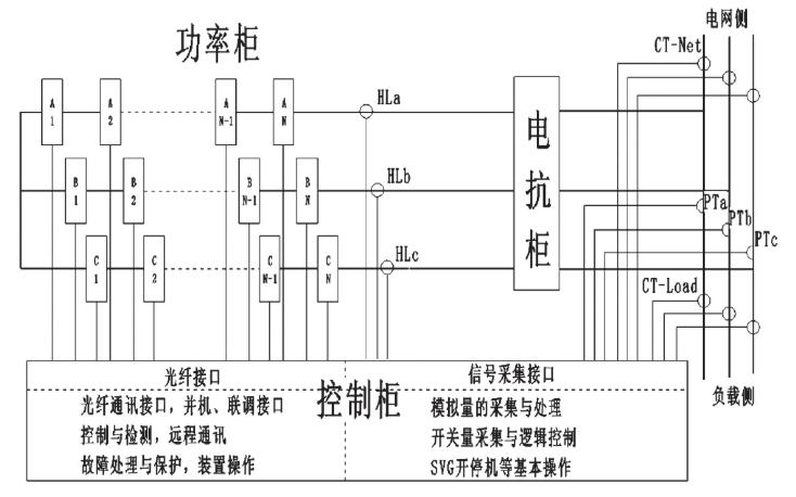 安徽中電HSVG高壓動(dòng)態(tài)無功補(bǔ)償裝置由控制柜、功率柜、電抗器組成??刂乒裰饕刂葡洹⒍慰刂七壿嬰娐?,其中控制箱通過光纖連接到功率單元。在功率柜里有三相功率單元,根據(jù)電網(wǎng)電壓等級不同,每相由若干個(gè)功率單元串聯(lián)組成,最后通過電抗器接入電網(wǎng)。